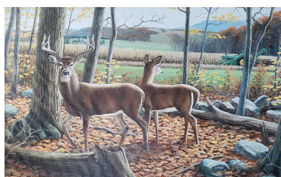 Dan met a buck on this trail to his archery stand. That buck was a small six point, so instead of the six point image he painted his recent nine point which was harvested in 2024.
